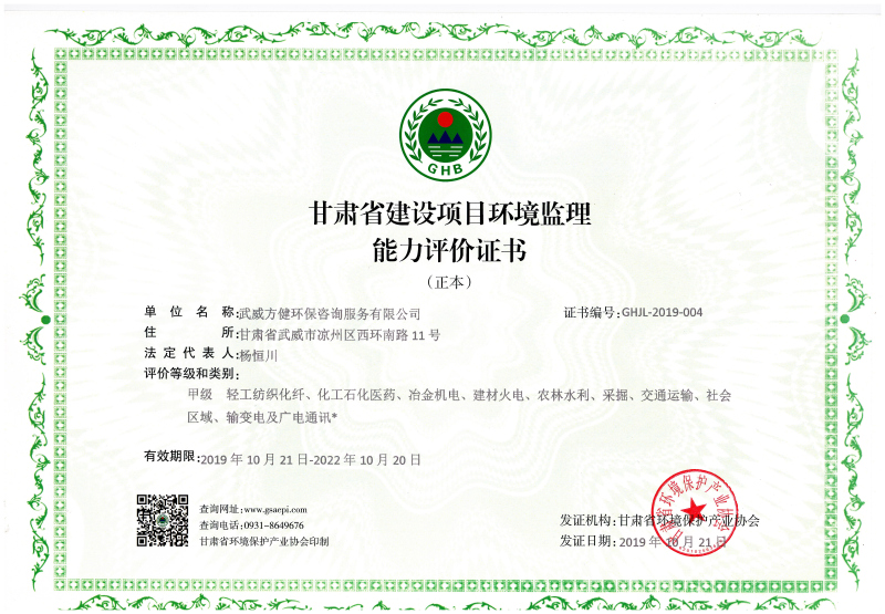 《甘肅省強(qiáng)制性清潔生產(chǎn)審核咨詢機(jī)構(gòu)資質(zhì)證書(shū)》(證書(shū)編號(hào):甘環(huán)(CP)L-09號(hào))《建設(shè)項(xiàng)目環(huán)境監(jiān)理單位備案證書(shū)》(甘環(huán)監(jiān)理字第015號(hào))